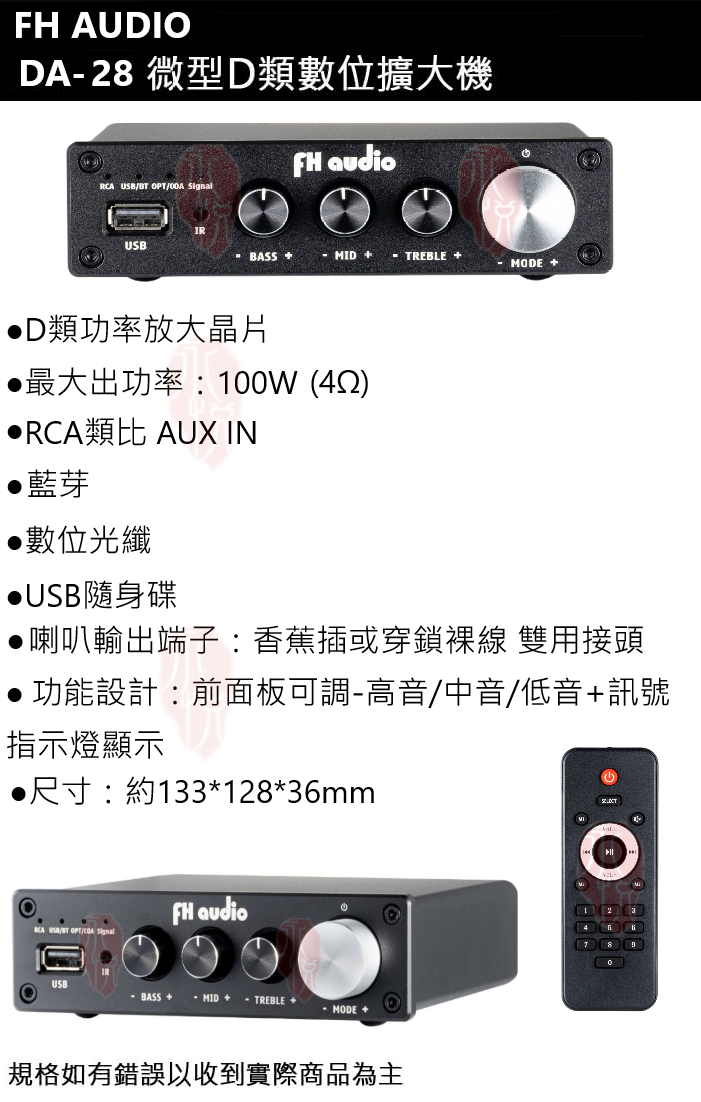 永悅音響 FHAUDIO DA-28 微型擴大機(光纖/USB/藍芽可調/高中低音) 全新公司貨