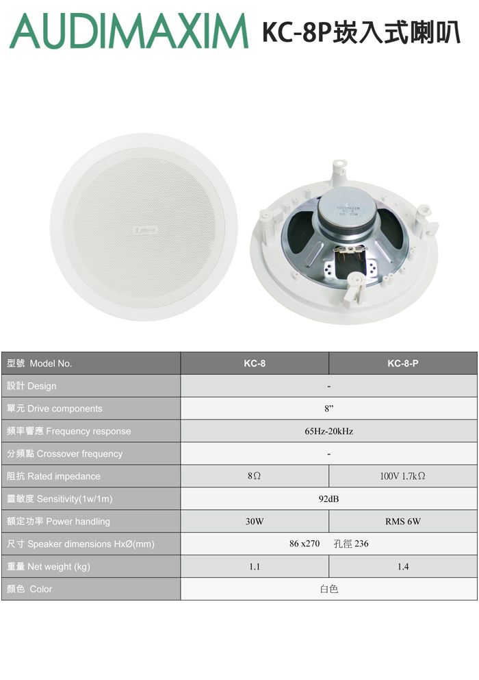 永悅音響 音樂大師 AUDIMAXIM KC-8P崁入式喇叭(對)全新公司貨 (免運)