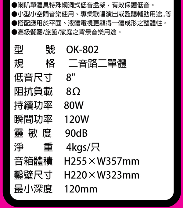Audioking OK-802 白色一對(8吋崁入式監聽/歌唱兩用喇叭)