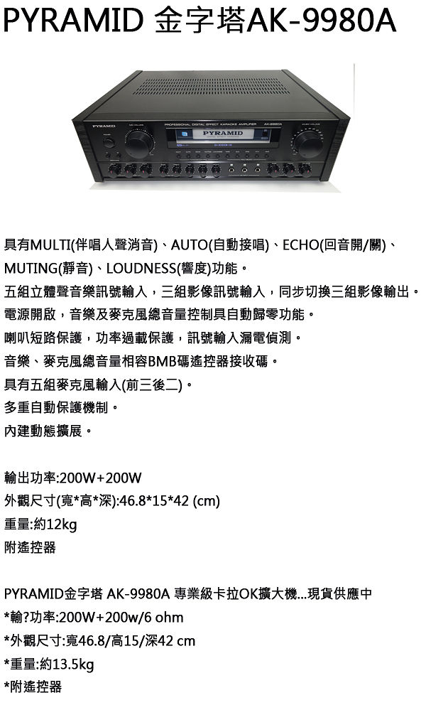 永悅音響 PYRAMID金字塔 AK-9980A 數位迴音卡拉OK綜合擴大機 贈三項好禮 全新公司貨