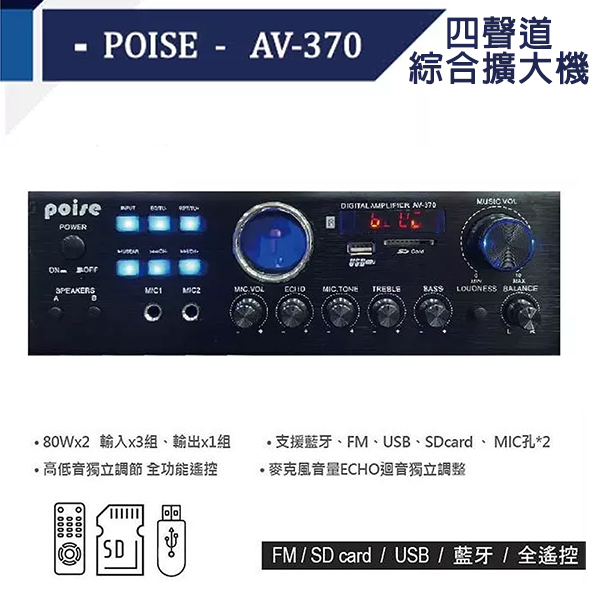 Poise AV-370BT 四聲道綜合擴大機(支援藍牙、FM、USB、SDcard、2MIC孔)