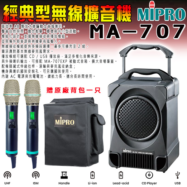 永悅音響 MIPRO MA-708 手提式無線擴音機 手握+發射器+頭戴式 贈保護套+麥克風收納袋 全新公司貨