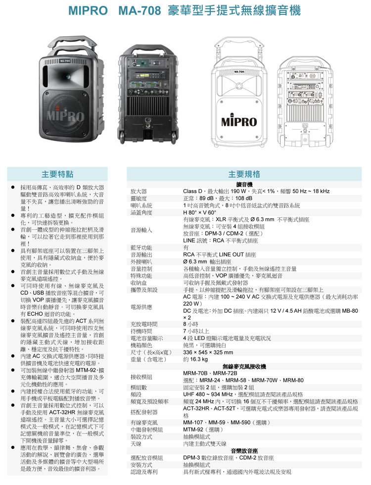 永悅音響 MIPRO MA-708手提式無線擴音機 手握+發射器+領夾式 贈保護套+麥克風收納袋 全新公司貨