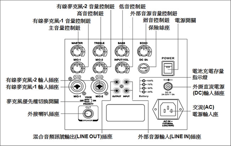 ■ 具有麥克風優先權切換裝置的設計,自動降低背景音量。