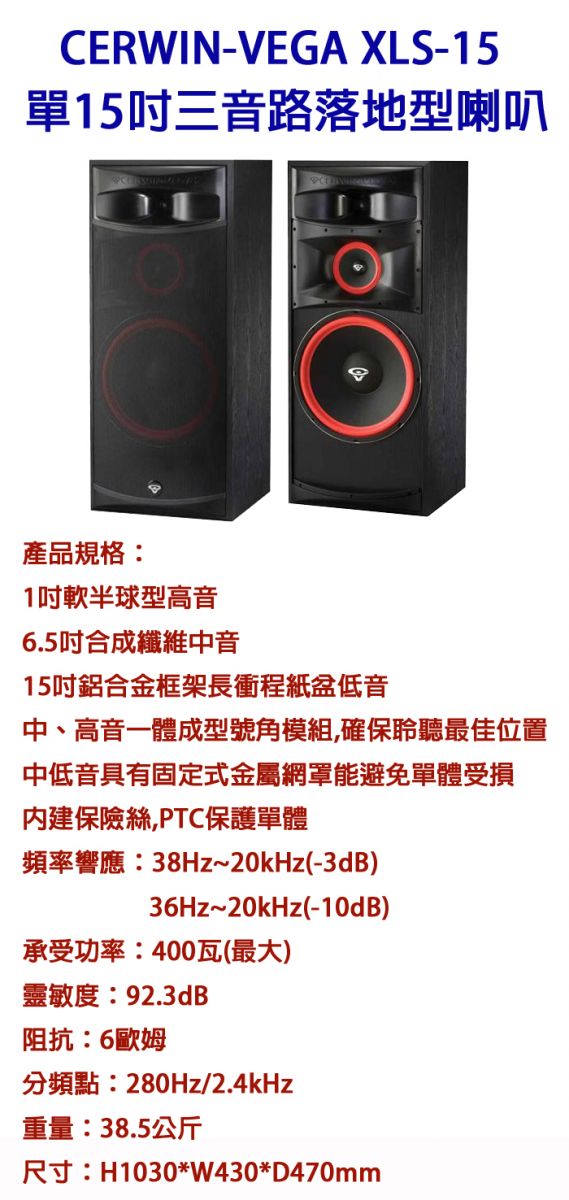 永悅音響CERWIN-VEGA XLS-15(對)15吋三音路落地型喇叭 全新公司貨(免運)