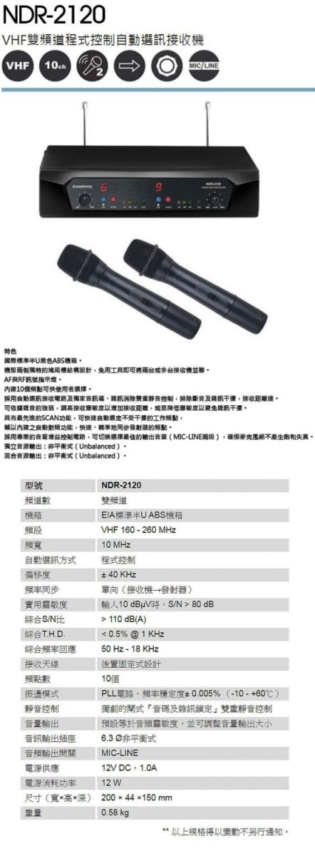 永悅音響CHIAYO NDR-2120 手持2支無線麥克風組全新公司貨 (免運)