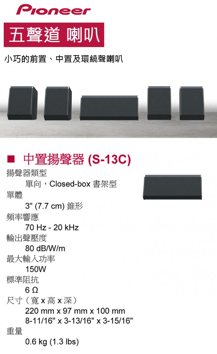 永悅音響 PIONEER S-13C + S-13S + S-13F 5聲道喇叭組(福利品)(含運)